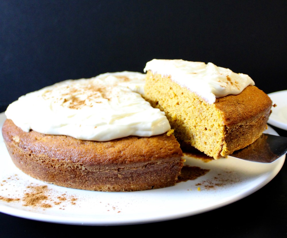 Once the cake is cooled, prepare the frosting with a hand mixer. In a large bowl combine the cream cheese, maple syrup and sifted powdered sugar using a hand mixer. The frosting will be a little loose. Using an off-set metal spatula, scoop all of the frosting onto the top of the cake. Using the off-set spatula spread the frosting on the top of the cake evenly, leave a 1/2″ border around the cake so the frosting doesn’t run down the sides of cake. Cover the cake with plastic cling wrap or a domed cake cover and refrigerate to chill the cake and set the frosting. Serve the cake cold and lightly sprinkle with a 1/4 teaspoon of cinnamon.